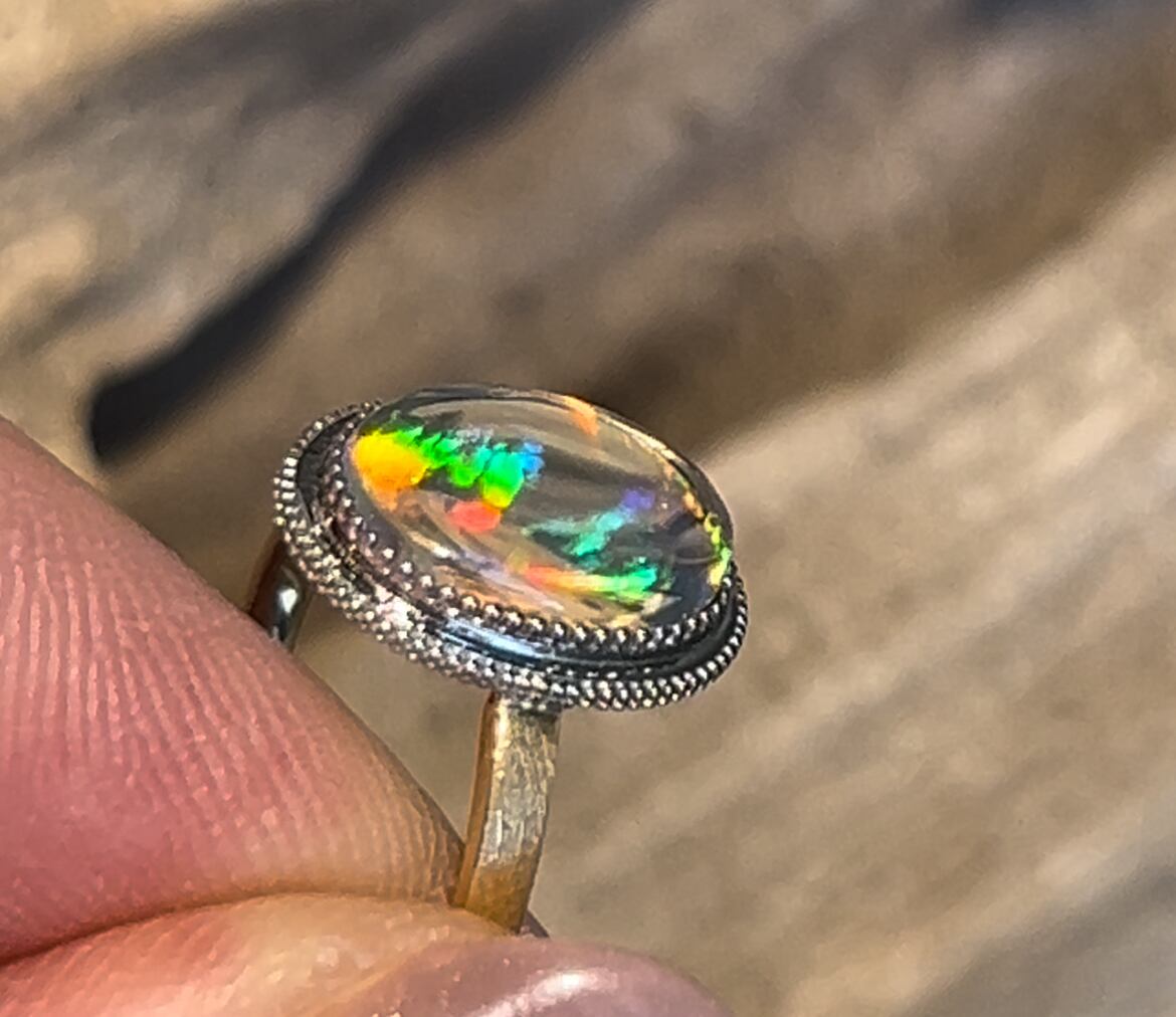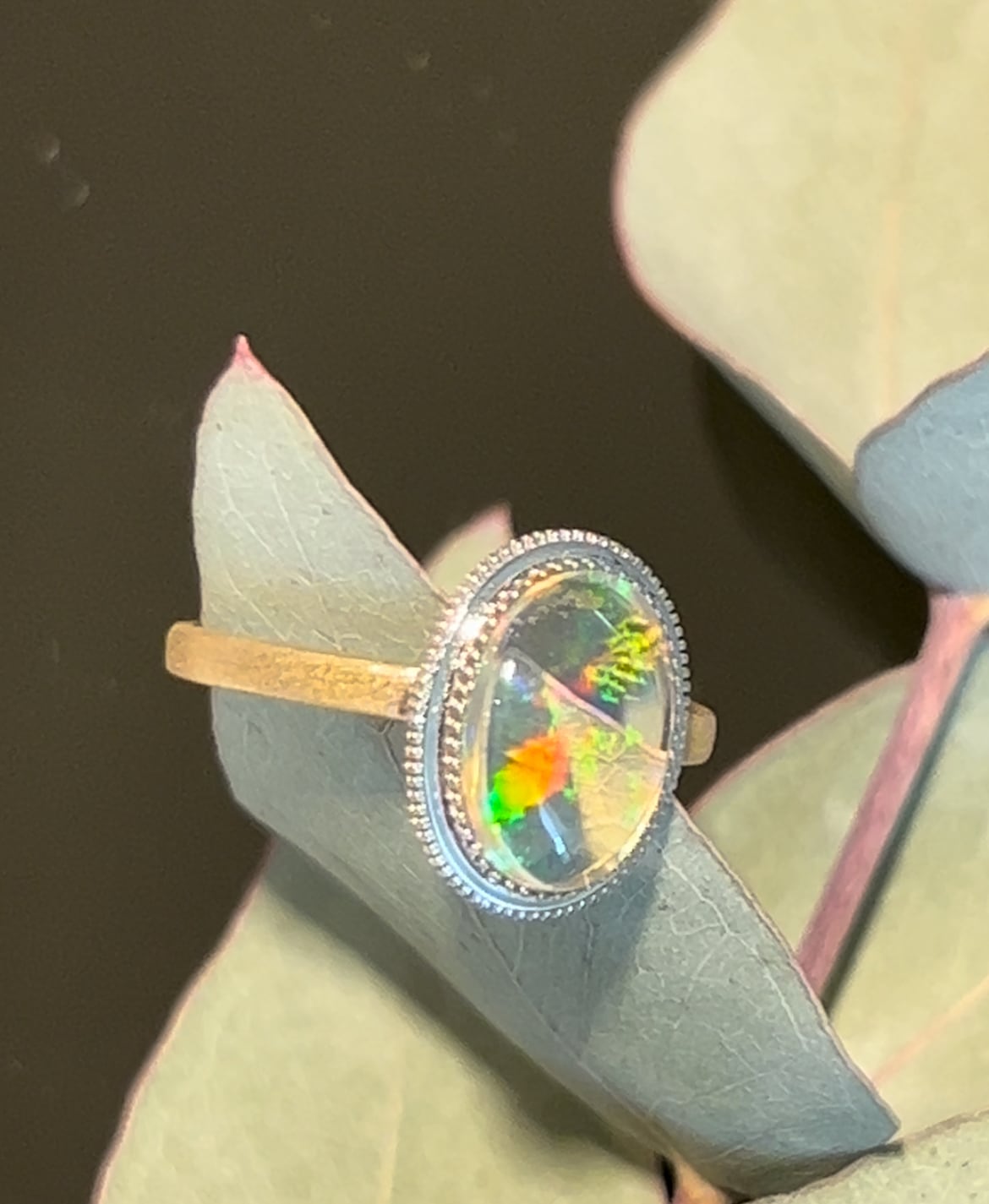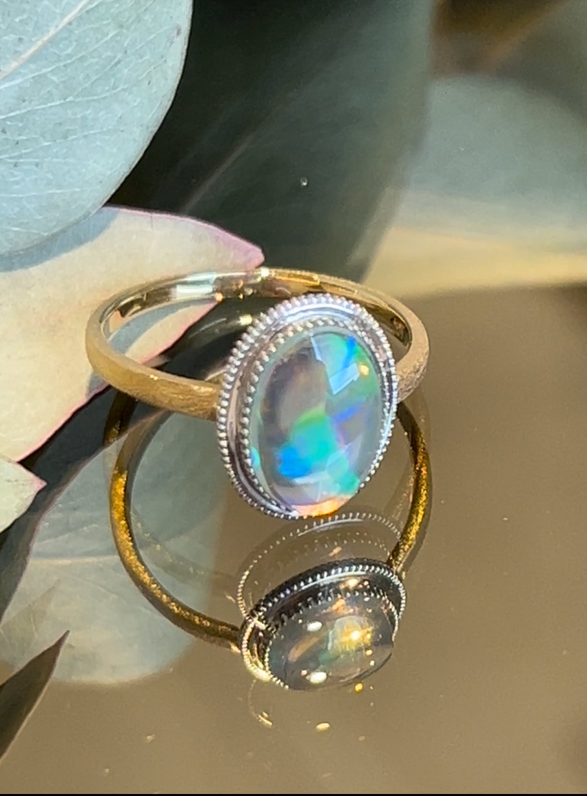 オパールならではの遊色が、光の加減でブルーやグリーン、オレンジへと表情を変え、まるで水面に映る虹のよう。